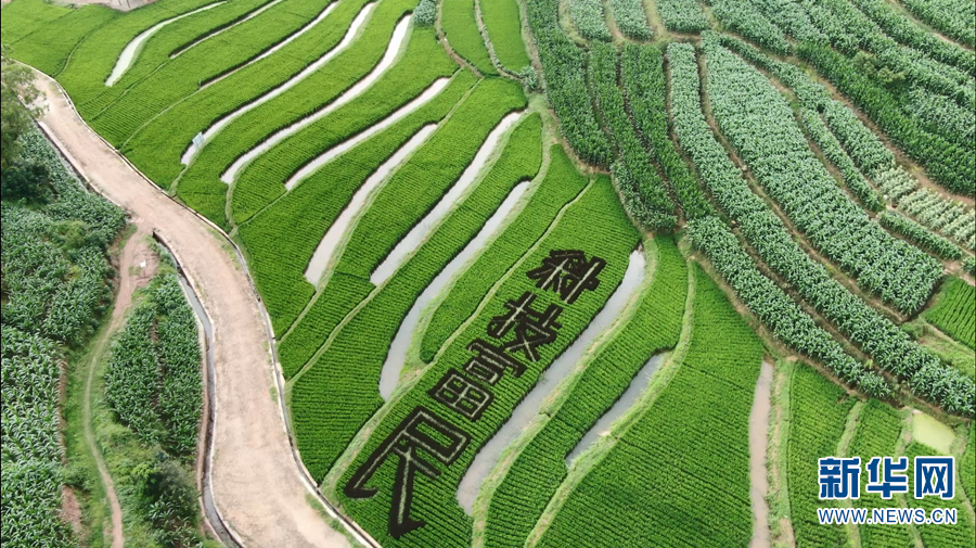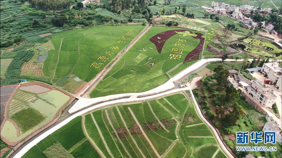 云南富民在100余亩稻田里“绘制”出稻田图景。(7月2日摄)。新华网发(富民县融媒体中心 供图)