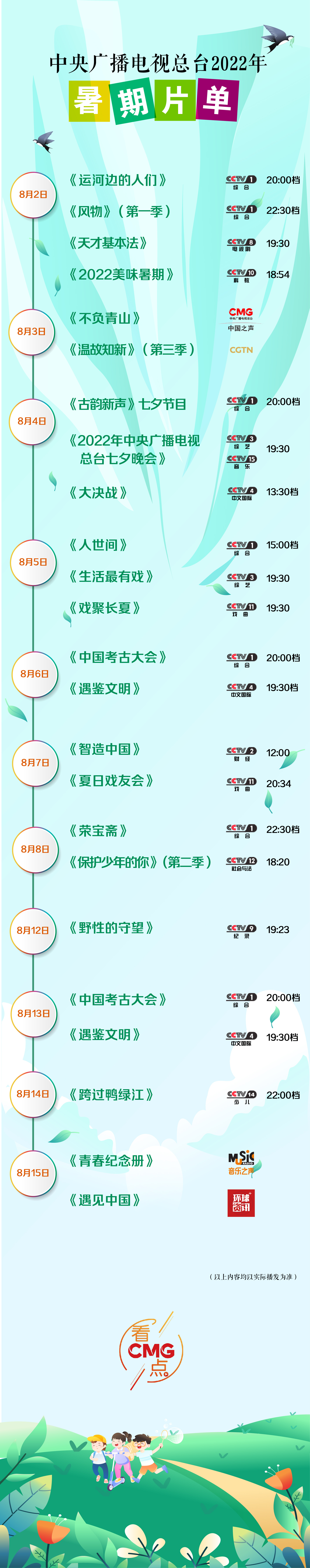 文艺经典,唱响暑期。校园歌曲,旋律镌刻记忆,哪首里有你的青春?8月13日,央视频、央视文艺联合推出网络直播节目《这YOUNG的夏天——2022夏日歌会》,通过不同时期的校园歌曲,唤起几代人深藏在心中的难忘时光。8月5日、12日,央视戏曲频道(CCTV-11)推出特别节目 《戏聚长夏》,邀请曲艺草根达人、戏曲新生代和国风音乐人等不同领域深耕戏曲文化的创演者,呈现不同风格的表演作品。