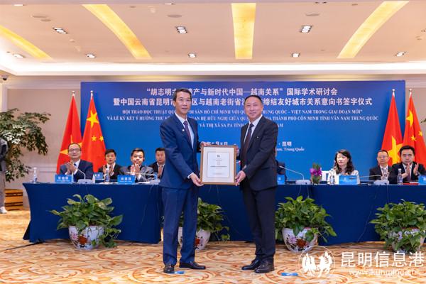 昆明信息港讯 8月8日上午,“胡志明主席遗产与新时代中国—越南关系”国际学术研讨会暨中国云南省昆明市五华区与越南老街省沙巴市缔结友好城市关系意向书签字仪式在翠湖宾馆举行,会议以视频连线及线上线下相结合的方式,分别在中国云南昆明和越南老街两个主会场同时进行。中共昆明市委常委、副市长安恩法,云南省人民对外友好协会专职副会长王宇,云南省文化和旅游厅副厅长杨德聪,市人民政府副秘书长张雪,中共五华区委书记陈江,五华区区长李亮,市外办主任张晓明,市文化和旅游局局长杨明俊等领导在昆明会场参加活动。越南驻昆总领事阮忠孝、越南外交部文化外交与联合国教科文组织司副司长范氏清平、越南文化体育旅游部国际合作局亚太处处长欧越兴、越南老街省文化体育厅厅长丁明河等越方领导分别在线上线下参加活动。