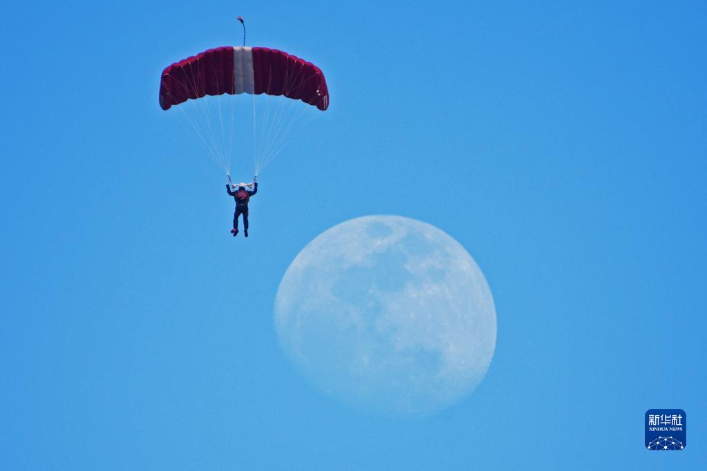 8月9日,红狮跳伞队在新加坡滨海湾举行的国庆庆典上表演高空跳伞。