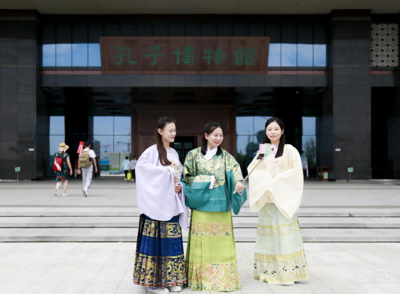游客在孔子博物馆前打卡合影留念(央广网发 孔子博物馆供图)