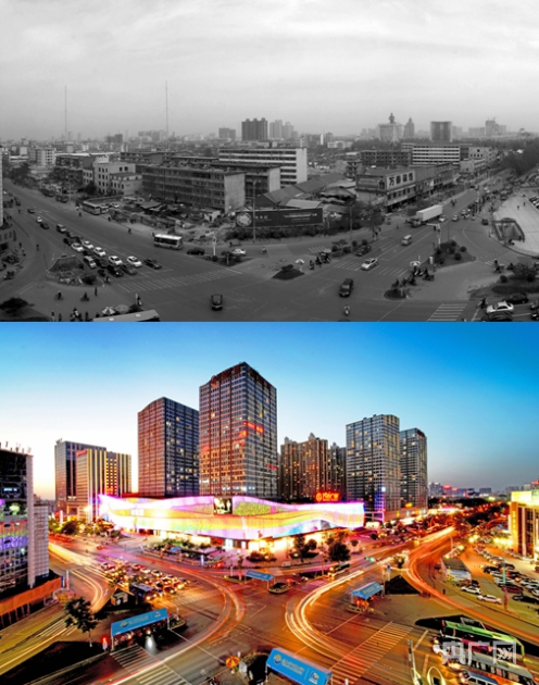 济宁太白楼东路发展对比图。上图:2012年太白楼东路路口 下图:2022年太白楼东路路口已成为商业中心(央广网发 郭刚 摄)