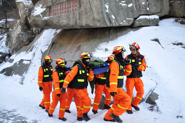 2017年1月23日7时22分,一名游客在泰山十八盘对松山附近摔伤,急需救助!消防救援人员们立即放下刚刚端起的碗筷,穿戴好装备,顶着严寒和大风,艰难地向对松山走去。8时20分,他们赶到对松山,对伤者的受伤部位进行固定,将他转移到担架上,盖上大衣,而后小心翼翼地抬起担架,向山下走去。狂风呼啸,索道早已停运,遍地积雪,环山路不再通车。顶着零下26度的严寒,踩着冰封的盘道,抬着担架,队员们一步一步从山顶走下山去,迈出的每一步都挑战着人体的极限。狂风、严寒、冰封的盘道和担架上的呻吟声压迫战士们的神经,大家轮流抬着担架,经过三个多小时的手抬肩扛,跨越1300米高差,走过7000多级台阶,终于到达山脚下,将伤者送上了等在山下的救护车。