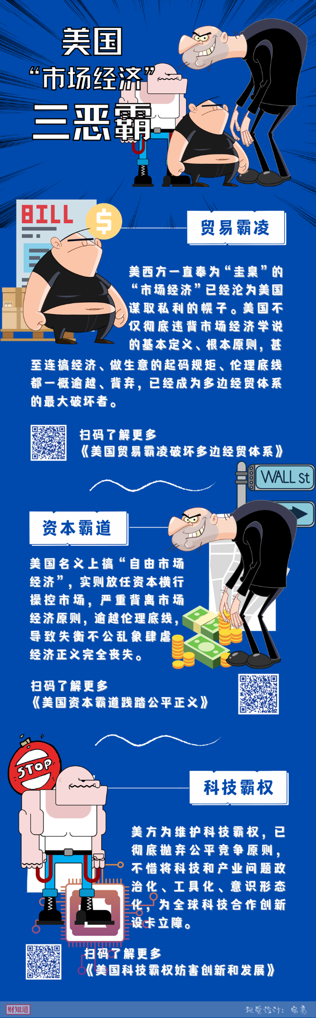 美国“市场经济”三恶霸2022-08-17 22:12:32来源:新华社近期,一贯以市场经济“名门正派”自居的美国加速向背离市场原则和商业伦理的邪路上逆行跑偏,日益暴露其贸易霸凌、资本霸道、科技霸权的本质。让我们扫一扫二维码,看清美国“市场经济”画皮下的三张恶霸嘴脸。