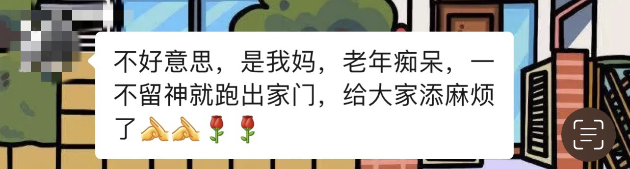 正当大家还在焦急等待老人家属的消息时,群里出现了一条消息,让大家悬着的心放了下来。“不好意思,这是我妈妈,她有阿尔茨海默病,一不留神就跑出家门了,给大家添麻烦了。”走失老人的女儿杨梅第一时间在群里告知了大家,老人已经平安接回到了家里。