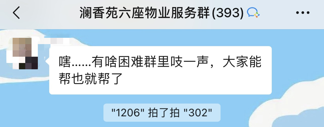 “一顿饭的事儿,有啥困难群里说一声,大家能帮也就帮了! ”12楼的邻居马上接过话茬,“我家里有一些肉和青菜,我放在楼道口,你们现在上来拿吧。”“我一个人菜挺多的,如果不够吃我给你们送过去一点。”25楼的邻居音音也在群里留言。