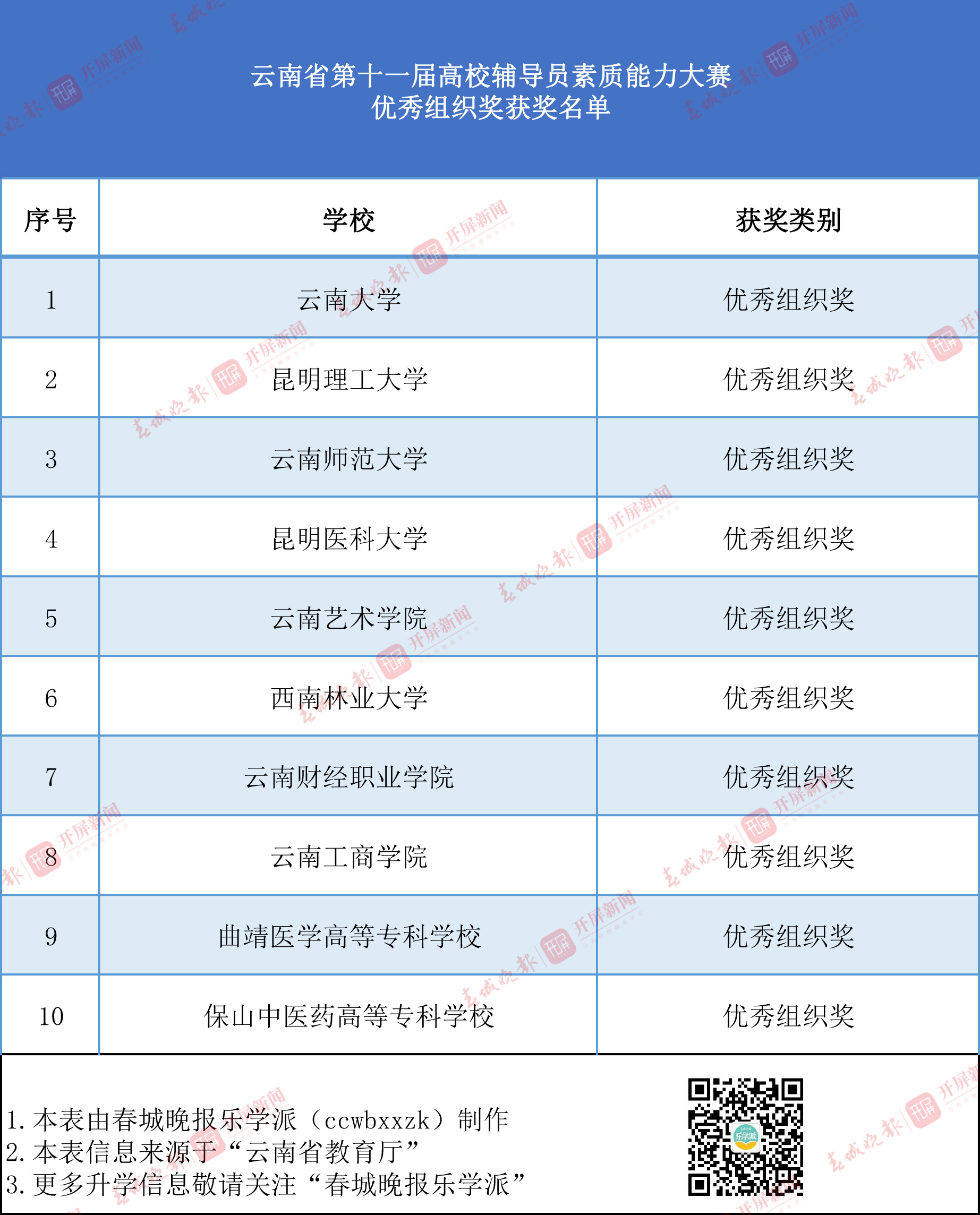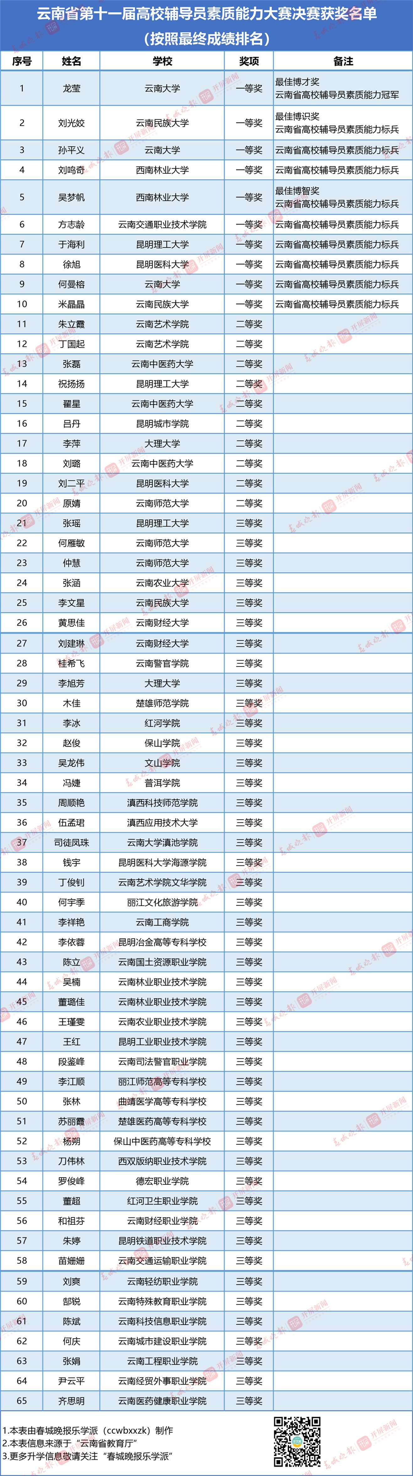 近日,云南省教育厅公示了“第十一届高校辅导员素质能力大赛获奖名单”。根据《中共云南省委教育工委办公室 云南省总工会办公室关于举办第十一届高校辅导员素质能力大赛的通知》要求,本着公平、公正、公开的原则,在各高校组织初赛的基础上,省委教育工委组织了云南省第十一届高校辅导员素质能力大赛基础知识测试及决赛。决赛共评选出一等奖10名、二等奖10名、三等奖45名,单项奖3名。根据大赛各个环节组织情况评选出优秀组织奖10项。现予以公示。