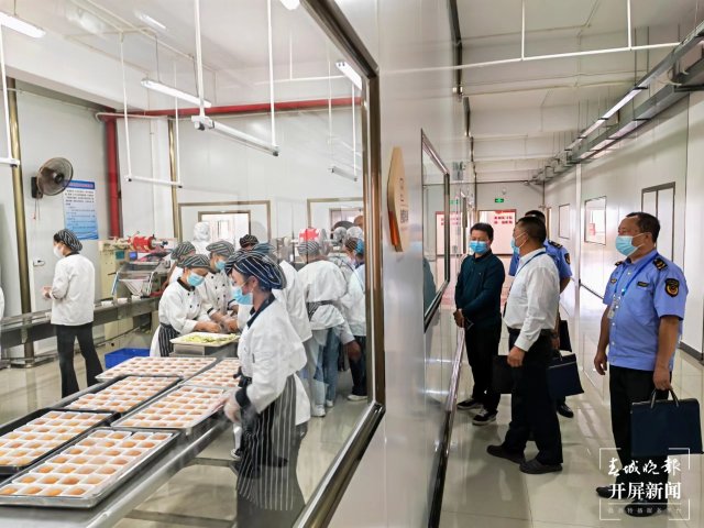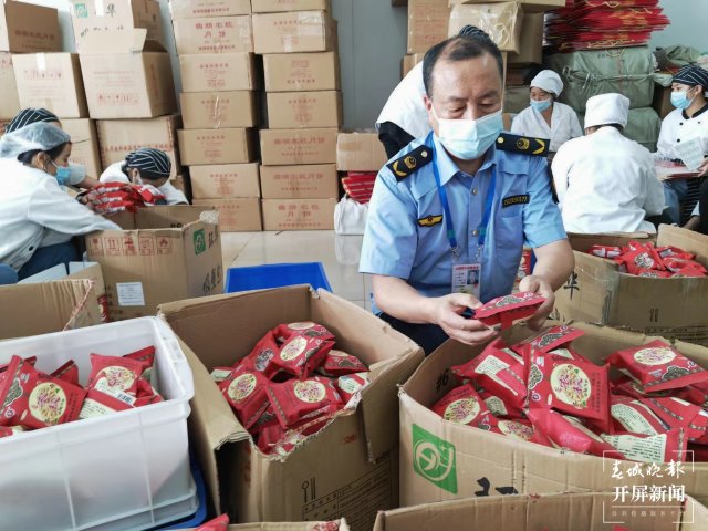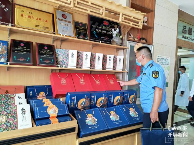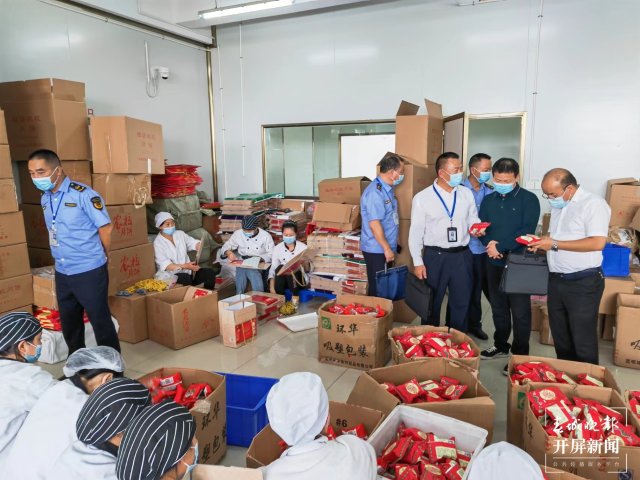 在曲靖一家本土月饼企业内,执法人员查看了火腿处理车间、月饼制作车间、烘烤车间及包装车间等,就检查月饼生产环节中的卫生问题、月饼保质期、明码标价、过度包装商品等诸多问题进行了详细检查,督促经营者依法诚信经营。