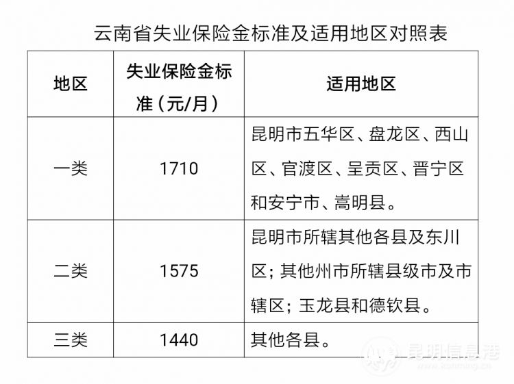 昆明市五华区、盘龙区、西山区、官渡区、呈贡区、晋宁区、安宁市、嵩明县,执行一类地区标准,即每月1710元。昆明市所辖其他各县及东川区,其他州市所辖县级市及市辖区,玉龙县和德钦县,执行二类地区标准,即每月1575元。其他各县执行三类地区标准,即每月1440元。