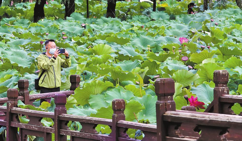 中秋节期间,春城市民积极防疫战疫,少远行、就近游,公园里度假日。图为昆明大观公园荷花池等景致吸引市民前来参观拍照。云南日报 记者 杨峥 摄