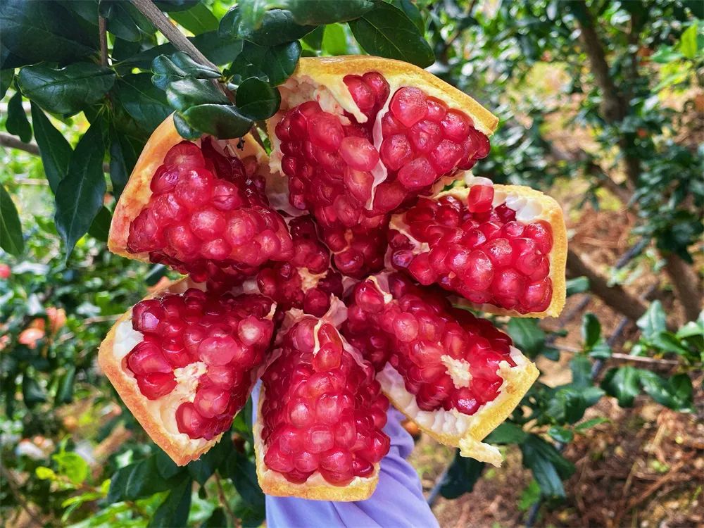 “金沙沃土育佳果,摘下玲珑谁先尝”。成熟的软籽石榴裂开一口,露出珍珠玛瑙般的籽粒,不禁让人垂涎欲滴。片角出产的“卜甲红”软籽石榴平均甜度在16.5至17.5度,优于普通品种,同时还有晚熟品种,一直可以采收到11月底。