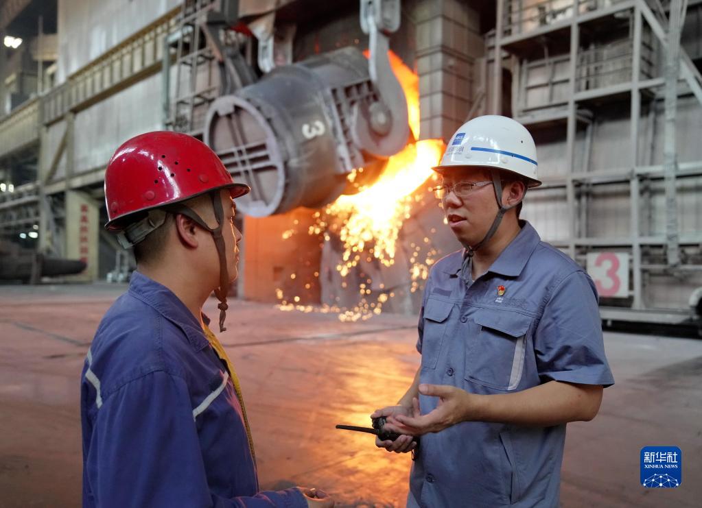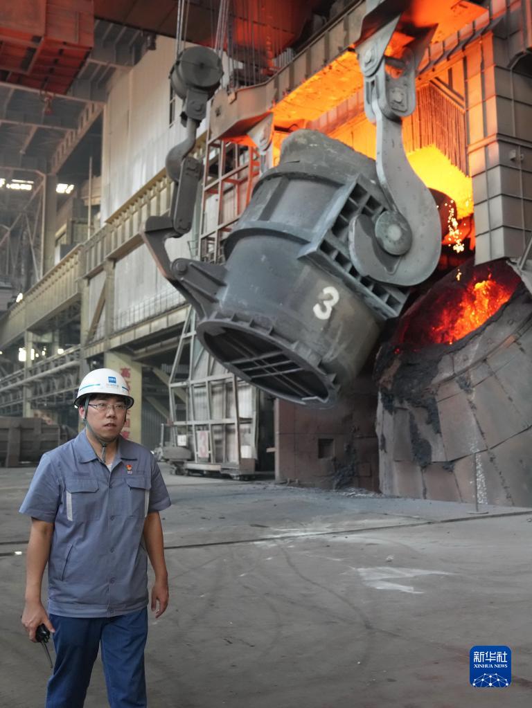 新华社石家庄9月27日电 记者齐雷杰 河钢集团邯钢公司邯宝炼钢厂转炉车间里,天车吊着巨型钢包隆隆划过,转炉中炉火通红,钢水翻涌。唐笑宇手持对讲机,冒着热浪叮嘱同事注意控制好转炉中间氧、出钢温度等指标。