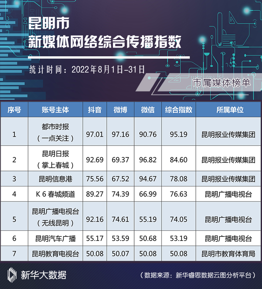 榜单由昆明市委网信办指导,昆明市网络文化协会发布。榜单依托新华大数据分析系统,从账号活跃度、内容创新力、账号互动性、传播扩散力四个维度对各单位(组织)认证的官方新媒体进行综合全面分析,客观反映昆明市新媒体网络综合传播力和影响力。(完)
