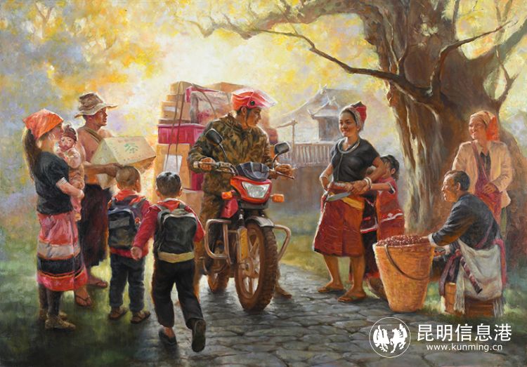聂钢的油画《快递送进佤山寨》通过村民收货快递的喜悦之情,表现了政府部门通过资金扶持,加大物流基础设施建设,打通了农村快递物流的“最后一公里”,对推进农产品进城到户、工业品下乡入村,促进城乡商品流通、拓展农村消费,促进乡村振兴具有重要意义。