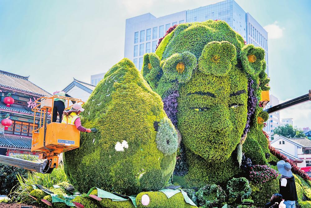 国庆将至,昆明市多个立体花卉景观启动养护换新工程。在位于金碧广场的“花仙子”景观点,园林绿化工作人员为“花仙子”换上当季开花的植物,为即将到来的国庆节营造节日氛围。(云南日报 记者胡妤雅 实习生田素素 陈聪)