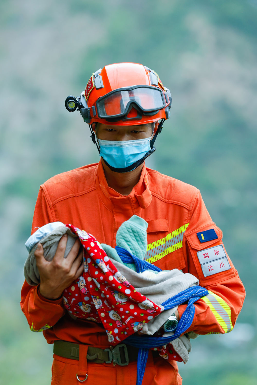 2022年9月6日,阿坝森林消防支队汶川大队队员张自立抱着一名从泸定县得妥镇湾东村疏散出来的2个月大的婴儿。新华社记者 沈伯韩 摄