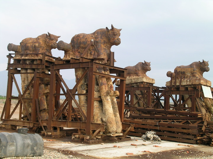 在中国传统文化里,牛是镇水神兽。黄河大铁牛位于毗邻鹳雀楼的蒲津渡遗址上,已近1300岁。它们面向黄河,怒目圆睁,前腿蹬后腿蹲,肌肉线条非常优美,体现了一种很雄壮的气势。