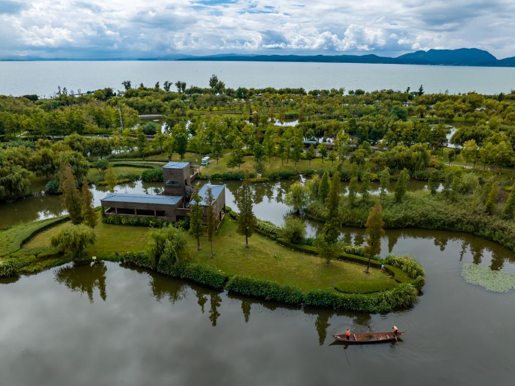 滇池斗南湿地公园的工作人员在湿地公园清理河道(无人机照片,2022年10月2日摄)。新华社记者 江文耀 摄
