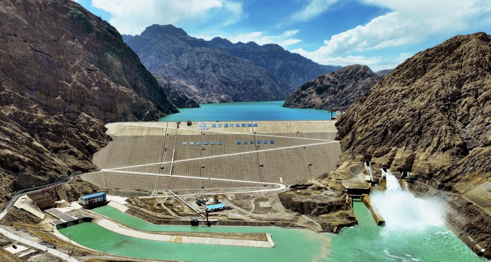 ↑这是2022年8月16日拍摄的阿尔塔什水利枢纽(无人机照片)。阿尔塔什水利枢纽工程位于新疆莎车县和阿克陶县交界处,地处喀喇昆仑山河谷,是叶尔羌河控制性水利枢纽工程。新华社发(阿布力克木·阿布拉 摄)