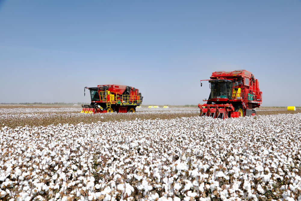 ↑2022年9月30日,两台国产采棉机在新疆尉犁县兴平镇统其克村的棉田里采收棉花。新华社发(汪志鹏 摄)