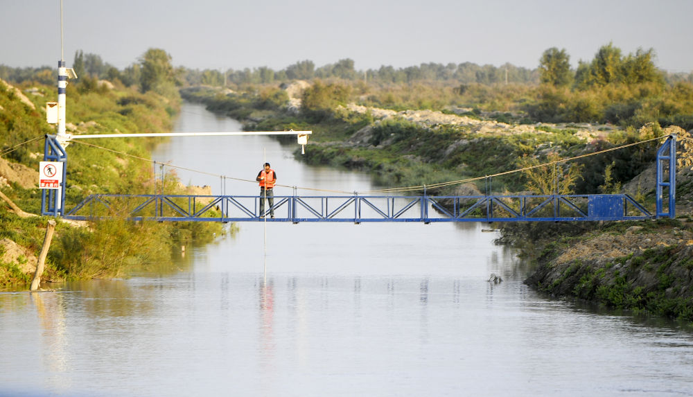 ↑工作人员在新疆阿克苏地区沙雅县沙德克确了生态闸旁收集水文数据(2022年8月13日摄)。新华社发(邹懿 摄)