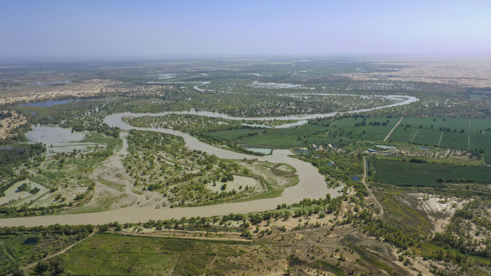 ↑塔里木河流经新疆阿拉尔市(2022年8月2日摄,无人机照片)。新华社发(肖玉磊 摄)