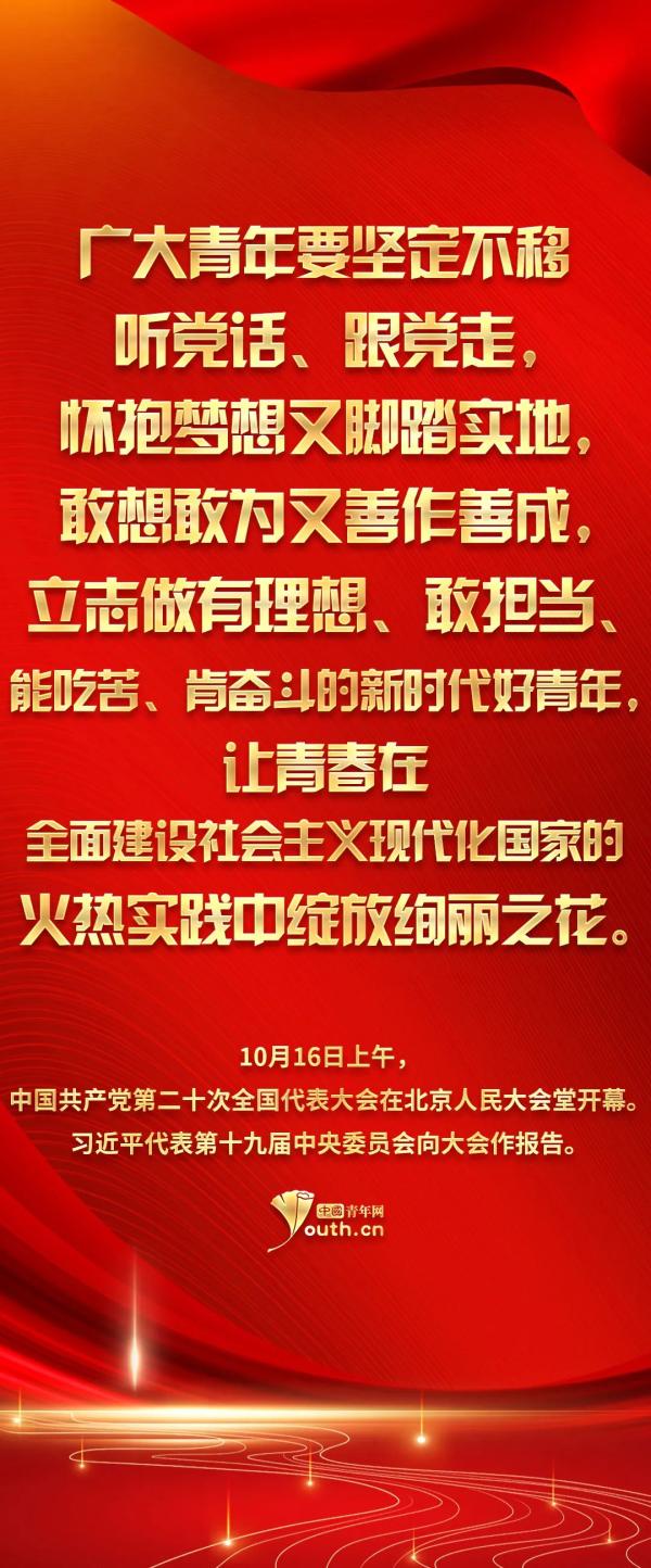 青年成长成才,要为祖国建功立业。在中国共产党第二十次全国代表大会开幕会上,习近平总书记作报告时殷切寄语青年:“广大青年要坚定不移听党话、跟党走,怀抱梦想又脚踏实地,敢想敢为又善作善成,立志做有理想、敢担当、能吃苦、肯奋斗的新时代好青年,让青春在全面建设社会主义现代化国家的火热实践中绽放绚丽之花。”