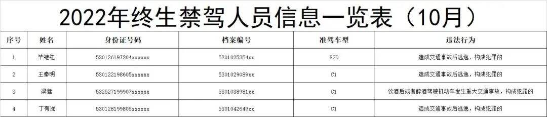 2022年10月,昆明共有4人被终生禁驾肇事逃逸、醉酒驾驶是严重交通违法行为,大家切记开车上路时一定要自觉遵守交通法律法规别等终身不能驾车才知道后悔,被终生禁驾的人员名单。↓↓↓