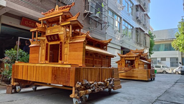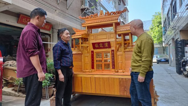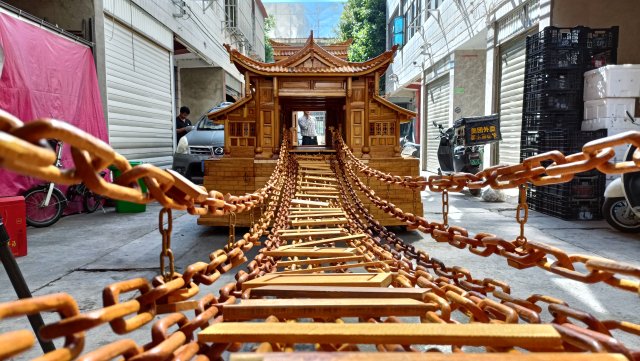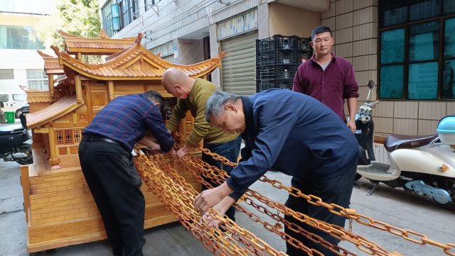 在玉溪市红塔区,退伍军人普明才和徒弟夏磊、彭勇、普春权,耗时3年多,雕刻了长8.2米、高2.2米、宽2.2米的泸定桥木雕作品。11月2日一早,红塔区玉带街道中卫社区3组的一条巷道里,72岁高龄的普明才师徒几人,正忙着组装木雕作品《飞夺泸定桥》。经过3个多小时的组装,整件作品组装完成,引来了不少市民驻足观赏。