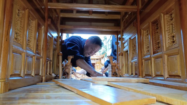 为了尽可能地复原泸定桥,2018年,普明才师徒四人来到四川大渡河上,拍下了两岸桥头古堡、铁索,以及建筑的每处结构细节。回到玉溪,普明才对这些结构反复研究,心中有数后,他买来了木料细腻又耐腐的黄杨木,和徒弟们开始了漫长的雕刻。