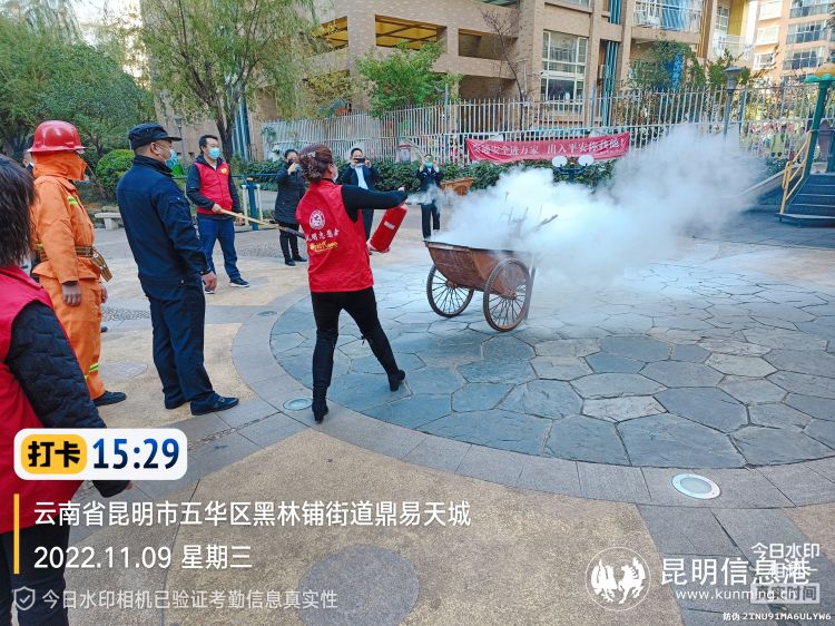 昆明信息港讯 为提高辖区消防安全意识,增强辖区居民与物业工作人员对消防设备的使用及自救常识,牢固树立“爱惜自己家园 驱逐火灾隐患”的理念,提高消防安全综合素质,营造稳定良好的消防安全环境,11月9日,国际花园社区联合鼎易天城物业、科医路派出所在鼎易天城小区开展了消防演练活动。