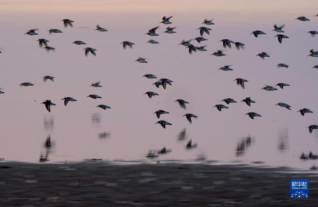 11月11日,候鸟在江西鄱阳湖南矶湿地国家级自然保护区的湿地上空飞翔。新华社记者万象/摄