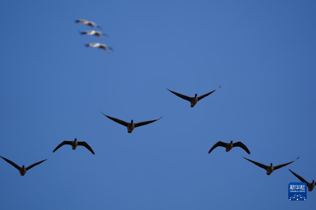 11月10日,鸿雁在南昌高新区五星白鹤保护小区飞翔。新华社记者周密/摄