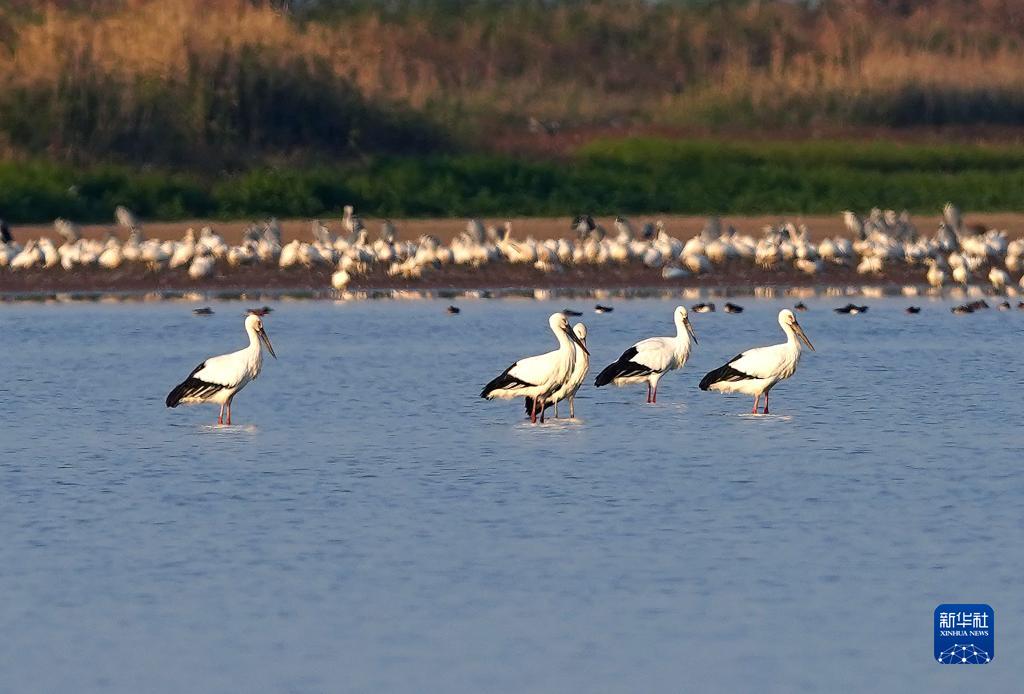 11月11日,东方白鹳等候鸟在江西鄱阳湖南矶湿地国家级自然保护区的湿地栖息。新华社记者万象/摄