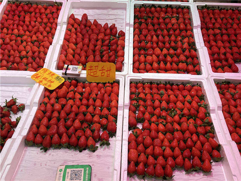 商户管先生介绍,金马正昌水果批发市场专门做草莓批发生意的有四五十家,目前每天有20—30吨草莓在市场交易。“我家一天能批出1吨左右的草莓,价格相比去年低了不少,去年品质较好的批发价25—30元/公斤,现在17—20元/公斤,而且销量不好。我们家一年四季都种植、批发草莓,主要供应奶茶店,但口感还是冬季、春季的比较好。过年后草莓的价格就会大跌,那时候量多、更便宜。”