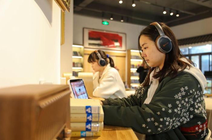 11月20日,市民在马鞍山市采石矶悦书房“听书”。新华社记者曹力/摄