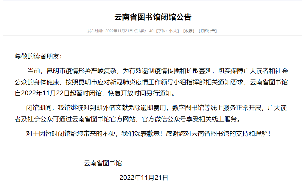 昆明信息港 记者刘欣彤 记者从云南省图书馆了解到,按照昆明市应对新冠肺炎疫情工作领导小组指挥部相关通知要求,云南省图书馆将自2022年11月22日起暂时闭馆,恢复开放时间另行通知。
