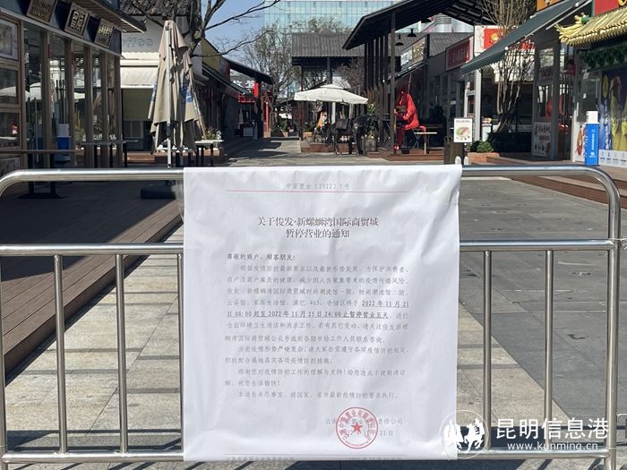11月22日,记者在新螺蛳湾国际商贸城滇忆465广场看到,往日络绎不绝的市场,已大门紧闭,只有身穿防护服的工作人员在进行消杀工作。据昆明螺蛳湾国际商贸城综合管理办公室主任、官渡区矣六街道党工委副书记赵元良介绍,昆明·螺蛳湾国际商贸城时尚潮流馆一期、时尚潮流馆二期、云品馆、家居生活馆、滇忆465、仓储区于11月21日08:00起至11月25日24:00止暂停营业5天,进行全面环境卫生清洁和消杀工作。