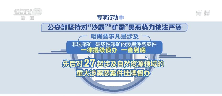 专项行动中,公安部坚持对“沙霸”“矿霸”黑恶势力依法严惩,明确要求凡是涉及非法采矿、破坏性采矿的涉黑涉恶案件一律提级侦办、一查到底。先后对27起涉及自然资源领域的重大涉黑恶案件挂牌督办,采取实地督导、视频调度、专家支持、约谈通报等方式推进,同步组织追缴一批黑恶势力敛聚的不义之财。