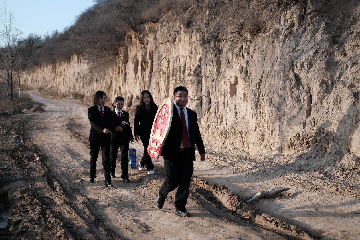 初冬时节,陕北小雪初歇,黄土高原被点缀得星星点点,黄白相间,宛若画卷。一辆法院审判车行驶在蜿蜒的山路上,车上的法官们正在电话解答老乡们的法律咨询。