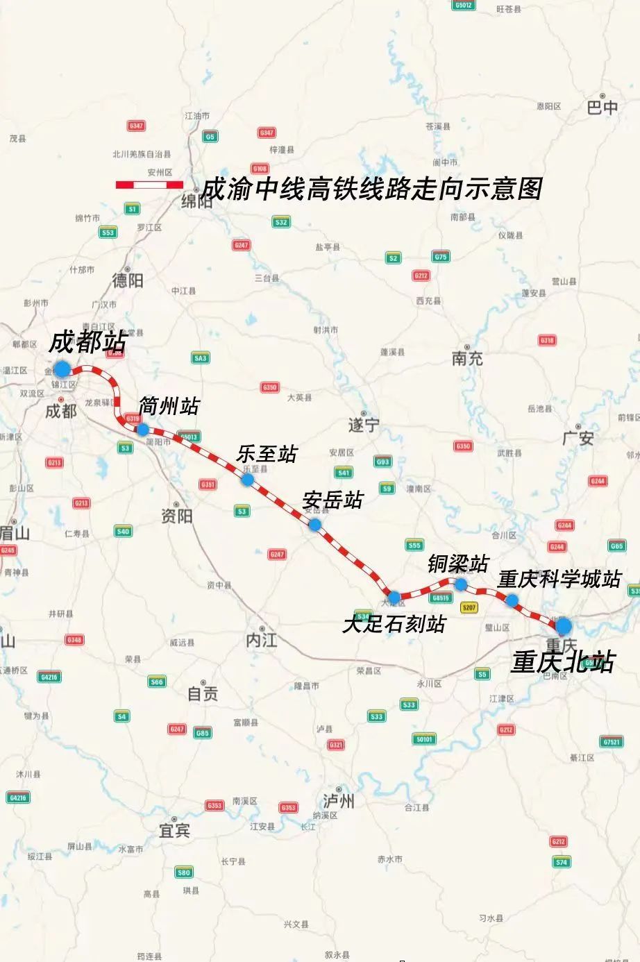 成渝中线高铁全线设重庆北、重庆科学城、铜梁、大足石刻、安岳、乐至、简州、成都8座车站,其中重庆北站为既有车站,成都站为改扩建车站,其他6座车站为新建车站。