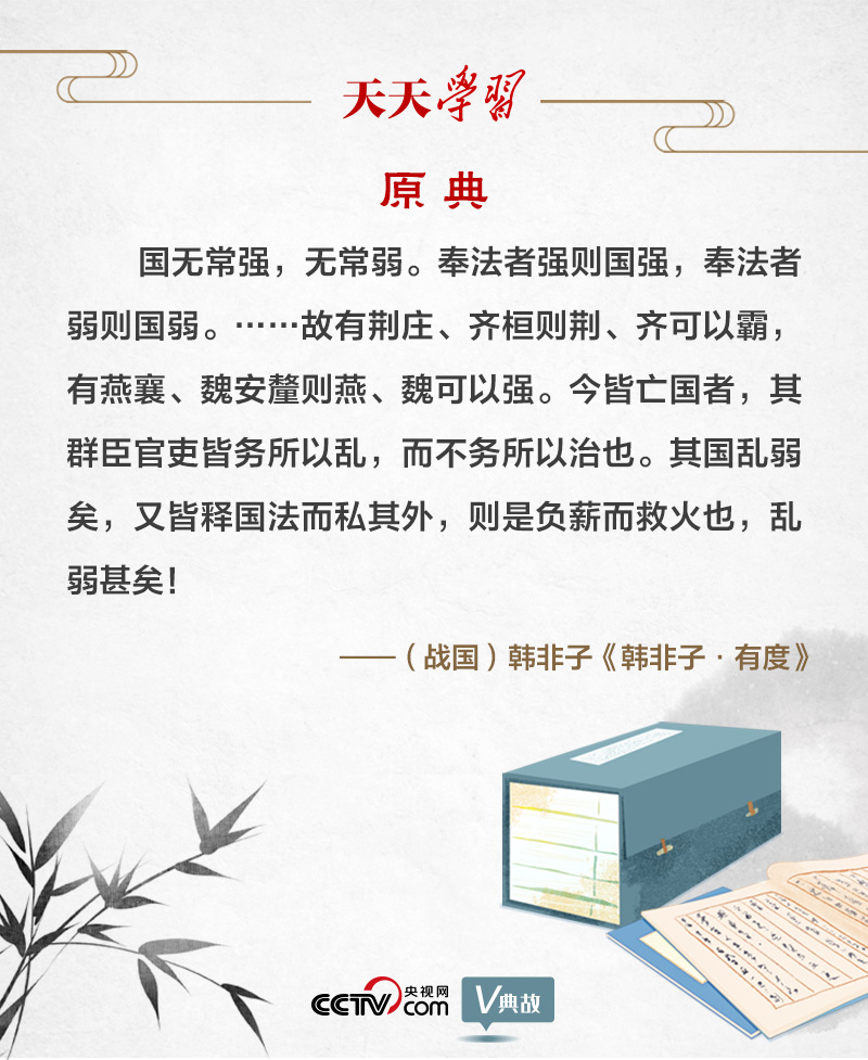 韩非子是战国时期法家思想的集大成者。“有度”,就是有法度。韩非子把“奉法”作为治乱兴亡的关键,提出“国无常强,无常弱。奉法者强则国强,奉法者弱则国弱”。意思是,国家不会永远富强,亦不会长久贫弱。执行法度的人坚决,国家就会富强;执行法度的人软弱,国家就会贫弱。
