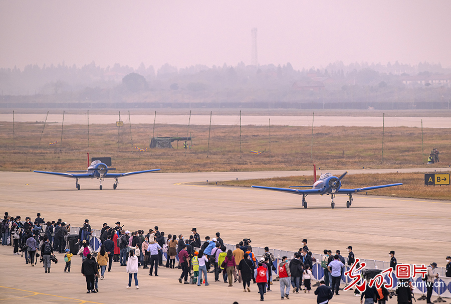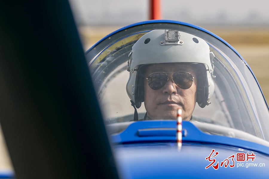 这是飞行表演结束后,部分队员在洪都三代教练机(初教6、教8、教10)的画作前接受检阅并合影。(蒋聚荣摄/光明图片)
