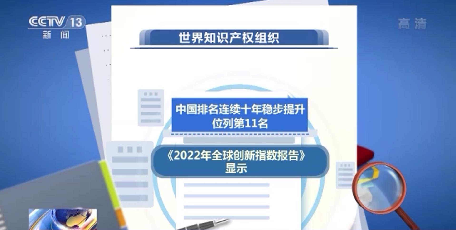 世界知识产权组织发布的《2022年全球创新指数报告》显示,中国排名连续十年稳步提升,位列第11名,比2012年提高了23名。