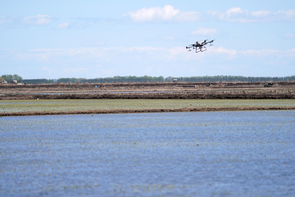 无人机在北大荒集团七星农场有限公司一块稻田中作业(2022年5月18日摄)。新华社记者 王建威 摄