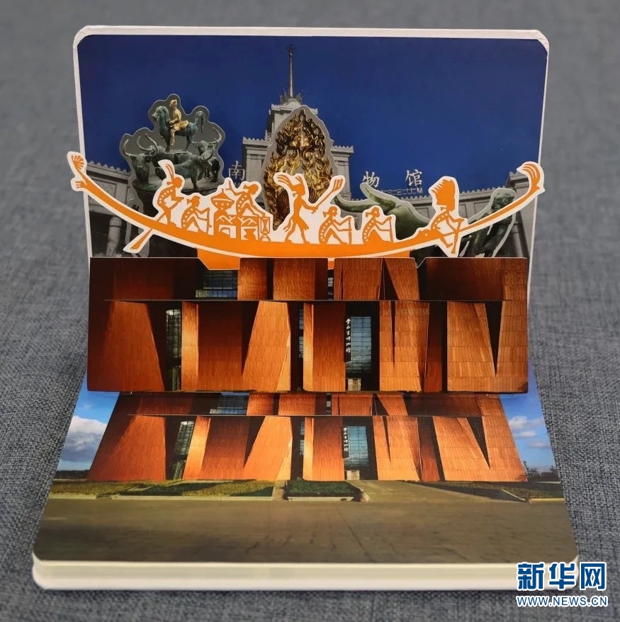 “打包”了银鎏金镶珠金翅鸟、牛虎铜案、四牛鎏金骑士铜贮贝器、广南羽人船纹铜鼓4件重磅文物的笔记本。新华网发(云南省博物馆 供图)
