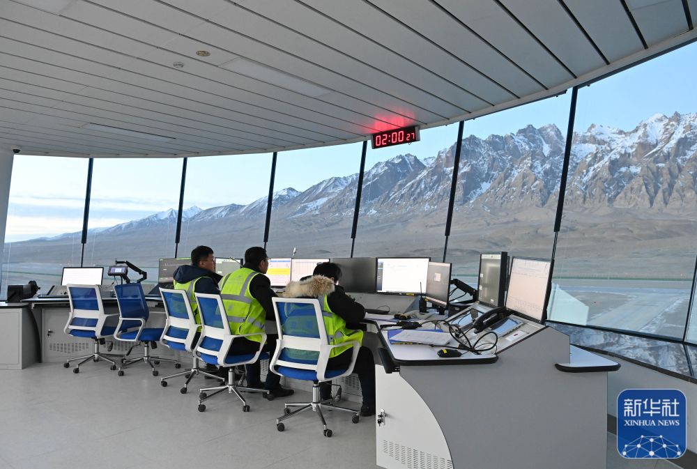 ↑12月23日,塔什库尔干红其拉甫机场塔台空管人员在进行飞机降落前的准备工作。