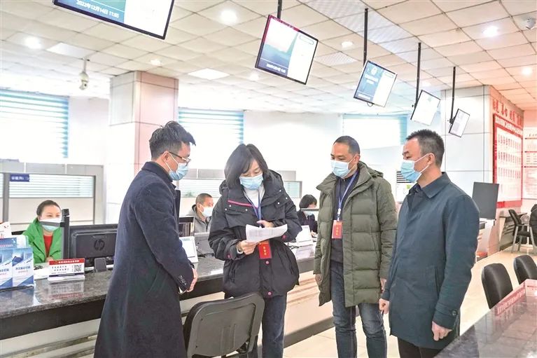 四川省宜宾市翠屏区纪委监委围绕惠企政策落实、政务服务等情况,下沉一线发现和整治在优化营商环境中敷衍塞责等问题。图为近日,该区纪检监察干部到区政务服务中心了解相关情况。李溦 摄