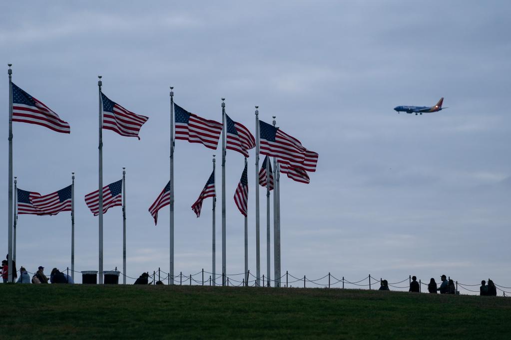 11月10日,在美国首都华盛顿,一架飞机从美国国旗上空飞过。新华社记者刘杰摄