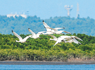 一群黑脸琵鹭在海南儋州湾上空飞翔。
